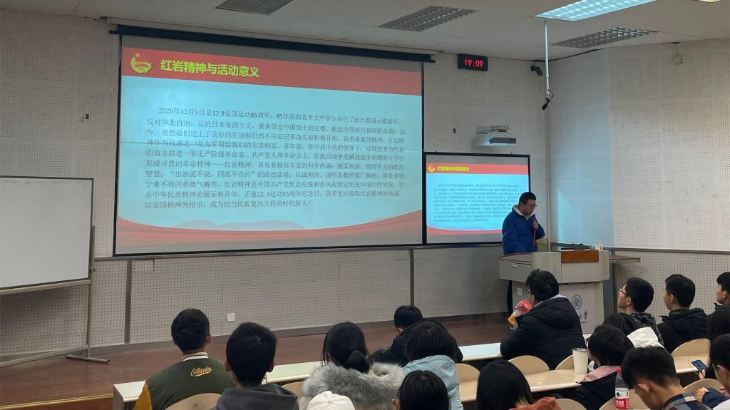 宣誓完毕,主持人何文斌为同学们介绍红岩精神与本次活动的意义,在一张张黑白的照片中散发着红色的光芒与先辈的英勇。同学们沉浸在对先辈的敬佩与缅怀中,久久不能自拔。