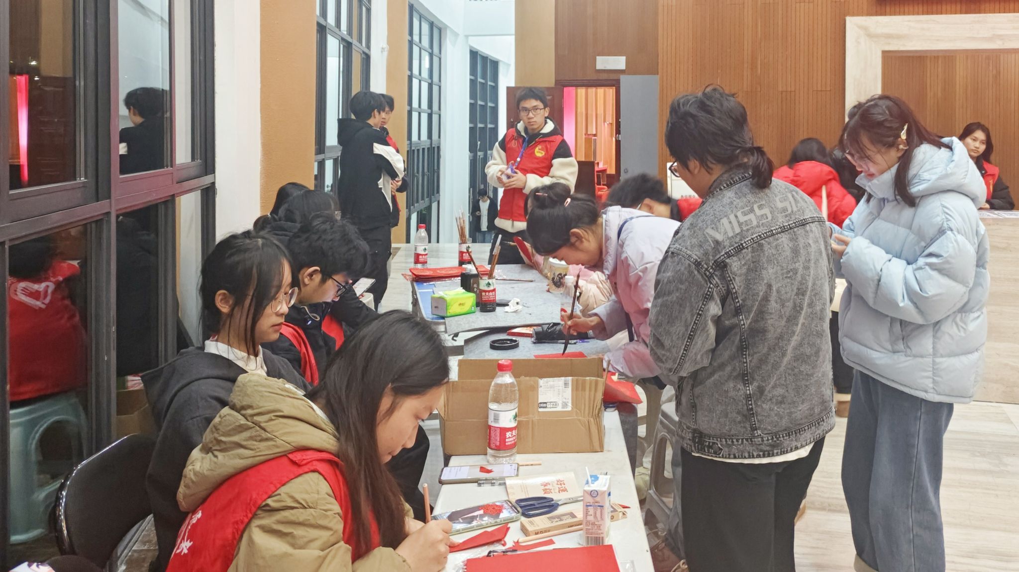下午5点,新春贺礼活动在虎溪校区小剧场外举行,师生通过写春联、剪窗花、送新年祝福等方式,表达对新年的美好祝福。
