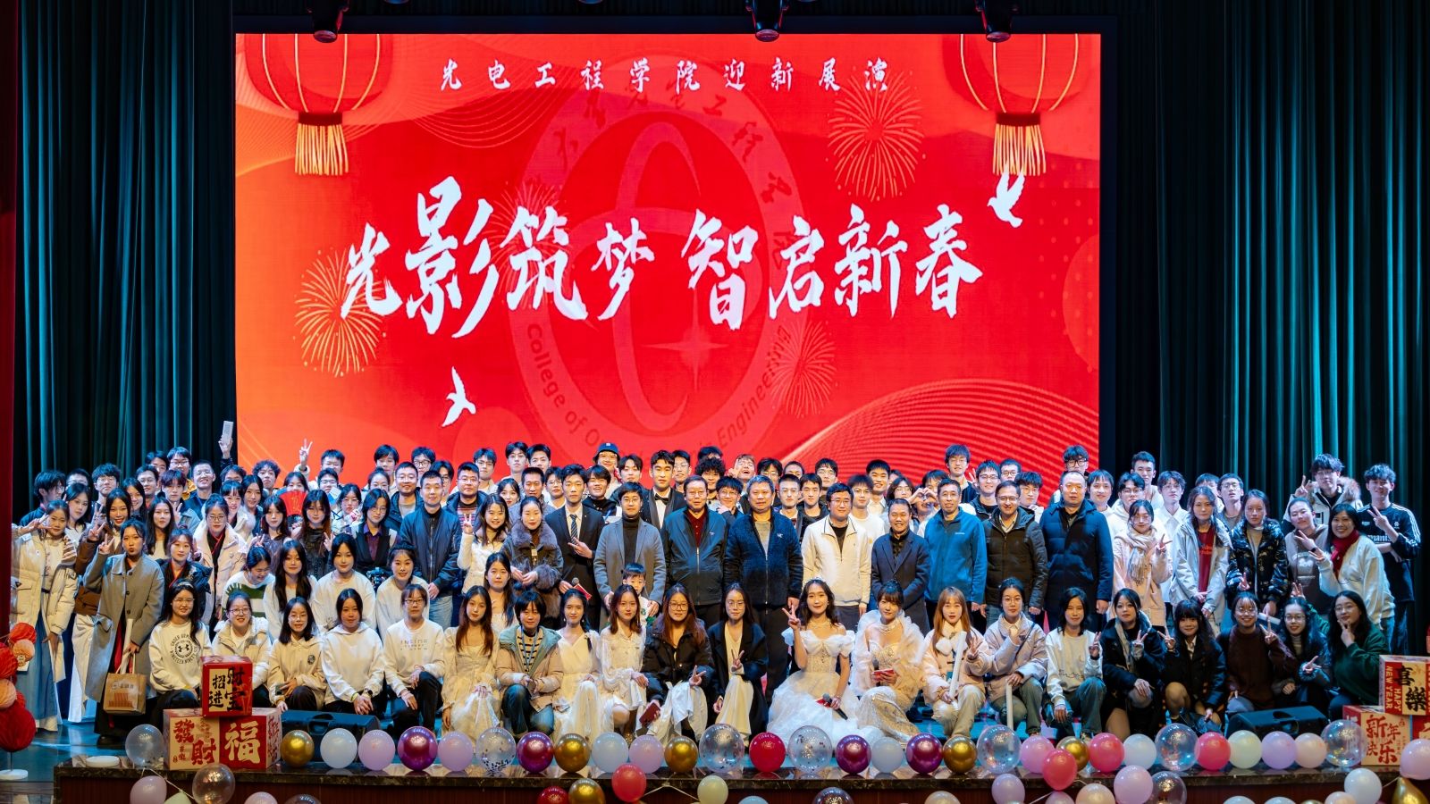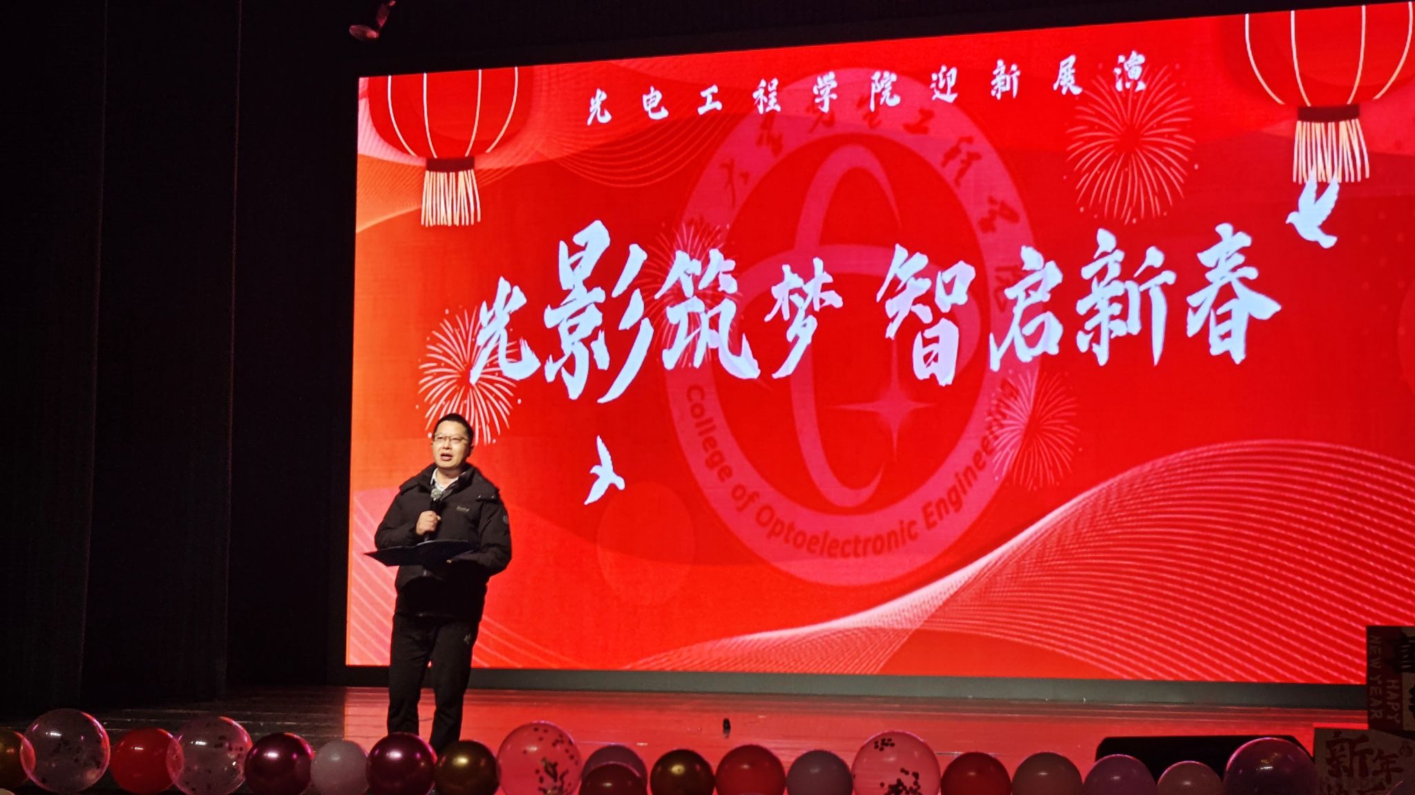 晚上19:30,公司第二届师生才艺展演暨“光影筑梦·智启新春”2025年迎新晚会在虎溪校区小剧场举行。熊辉代表公司致新年辞,他回顾了2024年全院师生取得的成绩,对全院师生的努力和付出表示感谢。他寄语光电学子,珍惜韶华,努力拼搏,勇攀高峰。他祝愿全院师生、全体员工在新的一年艰苦奋斗,团结协作,再创佳绩。