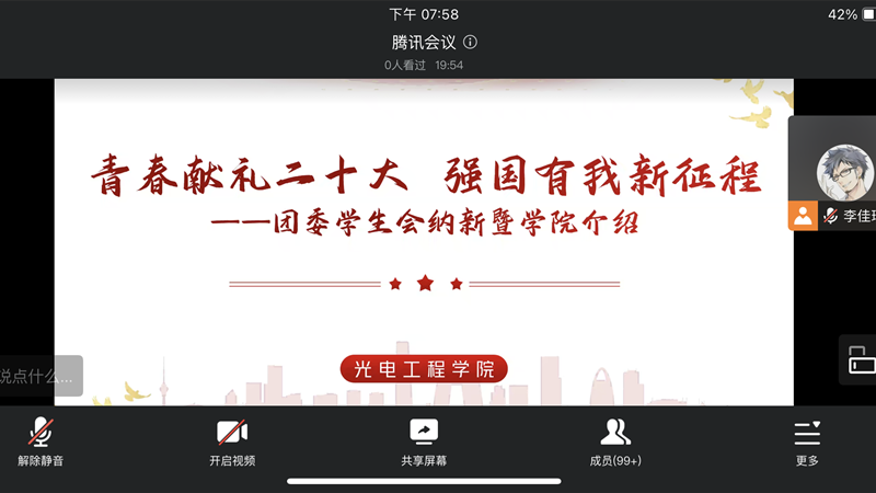 10月21日晚8时,威廉体育williamhill通过线上会议开展“青春献礼二十大,强国有我新征程”主题活动,进行光电团委员工会纳新暨威廉体育williamhill介绍宣讲,委副书记、纪委书记刘俊教授,公司团委书记罗莎、团委员工会各部门负责人及260余名本科生参加了此次会议。
