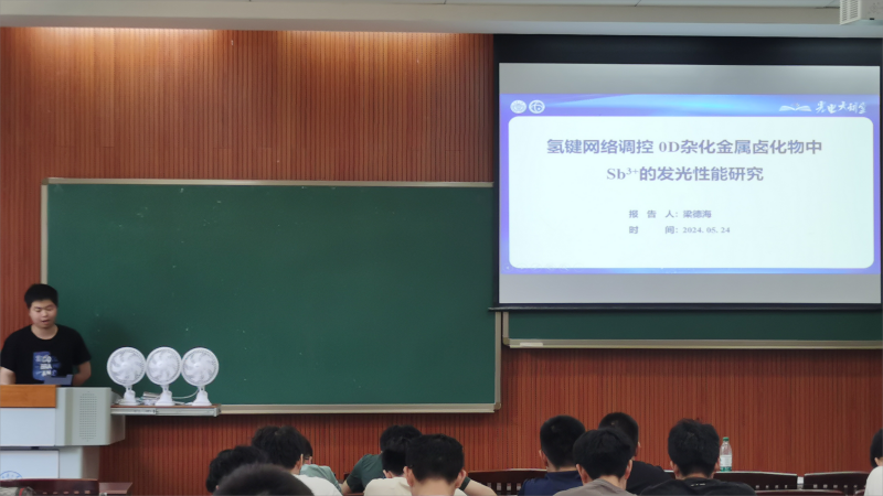 第三位主讲人是来自2021级光学工程专业的博士研究生梁德海,他报告的题目是《氢键网络调控0D杂化金属卤化物中Sb3+的发光性能研究》。他指出三价锑离子(Sb3+)在材料中具有良好的发光性能,可以通过不同的激发方式产生可见光发射;他介绍说可以通过氢键网络结构的调控手段,例如控制溶剂、表面配体等来调节Sb3+的发光性能;同时他探讨了其在发光器件、光电子器件或其他领域中的潜在应用价值和可能的应用前景。