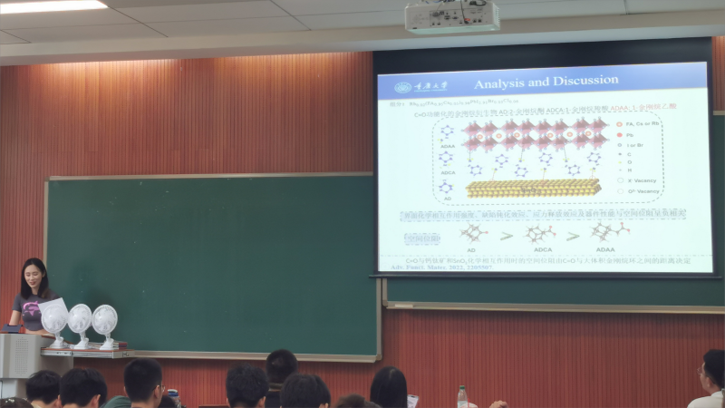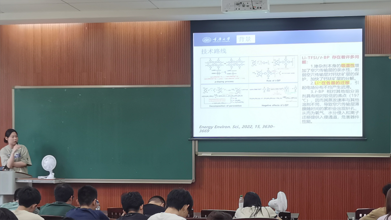 第一位主讲人是来自2021级光学工程专业的博士研究生周倩,她报告题目是《基于多活性位点分子调控钙钛矿表界面及高性能光伏器件的构筑》。稳定性和长期可靠性是制约钙钛矿太阳能电池商业化应用的重要因素,于是她介绍了可以通过多活性位点分子调控钙钛矿表界面;利用表面科学技术和原位监测手段,揭示分子调控表界面的影响规律;同时进一步对多活性位点分子在钙钛矿表面的修饰过程进行实时监测和表征以评价其光伏特性。