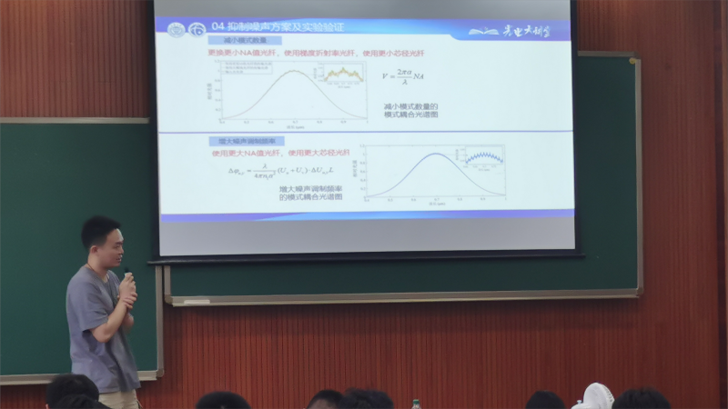 第四位主讲人是来自2021级光学工程专业的硕士研究生肖昀豪,他报告的题目是《光谱精密测量系统中宽谱相干光干涉噪声研究》。 他首先介绍了光谱精密测量系统的基本原理、构成和应用领域,对宽谱相干光的概念、特性和产生方法进行阐述;接着,他指出对于利用宽谱相干光进行光谱精密测量的系统,如何有效地处理干涉噪声、提高系统的测量精度和稳定性是一个关键问题;然后,他分析和讨论了噪声来源、影响因素和噪声特性;最后,他探讨针对宽谱相干光干涉噪声的解决方案和优化策略。