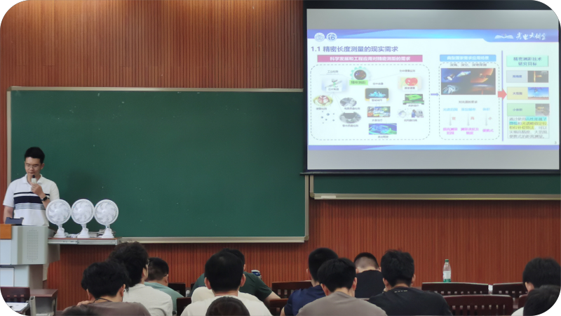 第二位主讲人是来自2023级仪器科学与技术专业的博士研究生杜伟,他报告的题目是《基于色散调控的片上孤子微梳精密测距技术研究》。他基于从色散干涉的理论出发,介绍了对色散这一重要光学参数的精密测量方法。他还以光栅组为例,阐述了一种基于频梳线性色散(GDD)调控的方法,并介绍利用其搭建了基于色散调控的光谱干涉长度测量系统,所提方法在提高测量精度与稳定性的同时,解决了传统DPI方法中存在的极值点处不可测范围和测量方向性模糊两个问题。