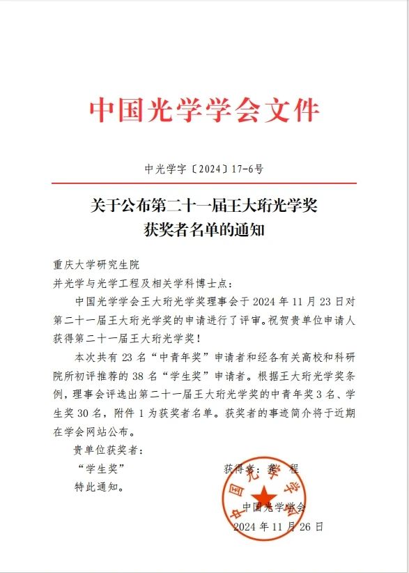 公司光学工程专业2020级博士研究生龚程(导师:臧志刚教授)入选2024年度王大珩光学奖员工奖。