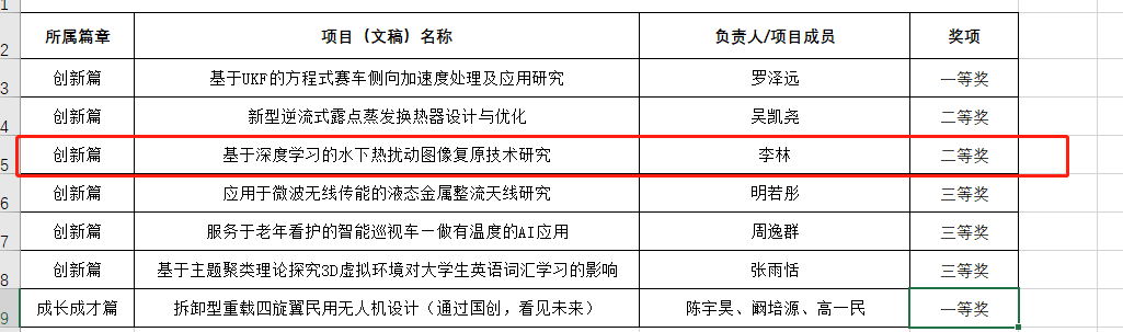 公司于2022年5月10日发布了“国创计划”十五周年纪念丛书征文活动的通知, 对该丛书《创新篇》《创业篇》《成长成才篇》内容进行了征集。征文时间截止后,本科生院组织专家进行了评审,其中《创新篇》评选出一等奖1名,二等奖2名,三等奖3名,《成长成才篇》评选出一等奖1名。