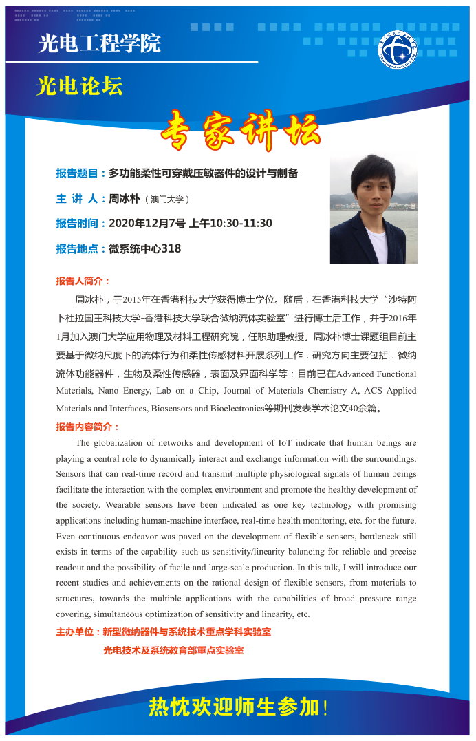 【光电论坛】多功能柔性可穿戴压敏器件的设计与制备