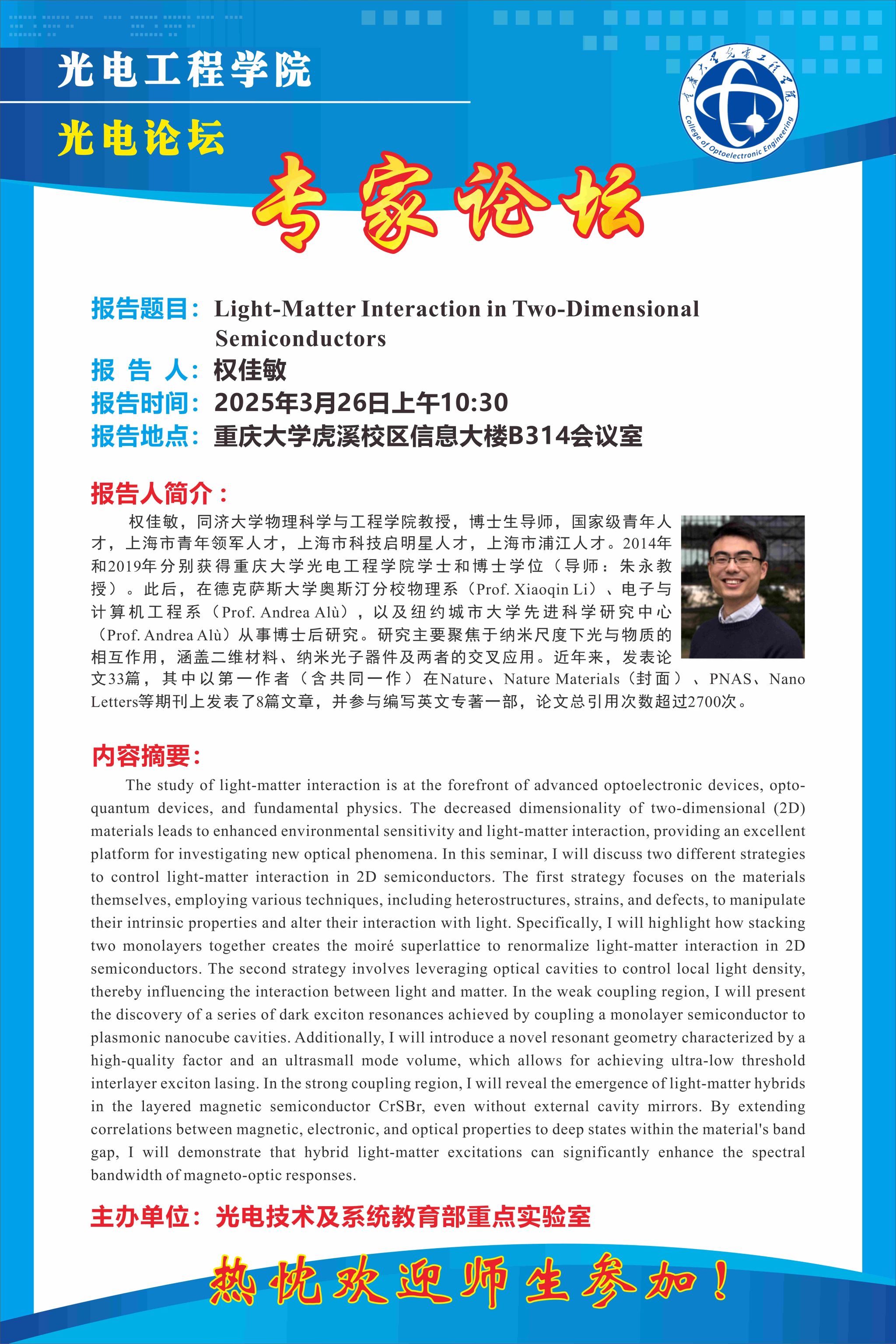 【光电论坛】Light-Matter Interaction in Two-Dimensional Semiconcuctors